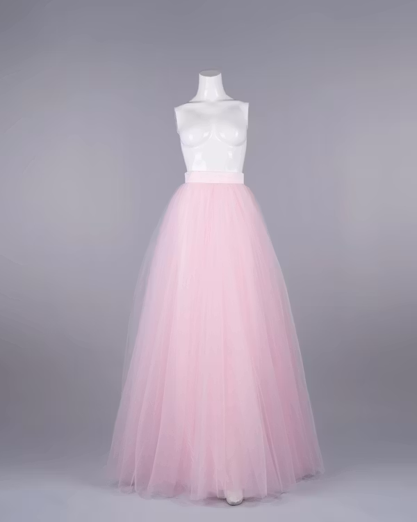 Kjolen är i en tunn brudtyll, som ger ett böljande och vackert fall, samt ett rosa duchessfoder och ett skönt viscosefoder längst in.
