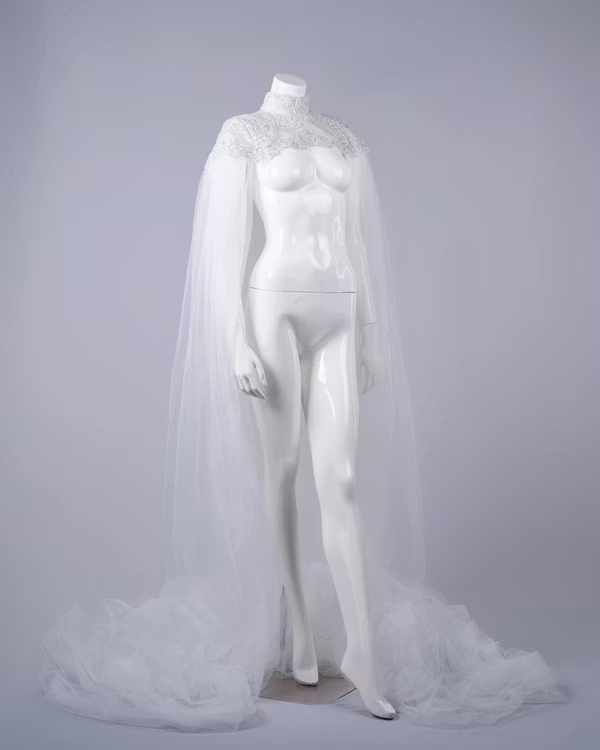 Vacker cape med en slöjsiluett, med handsydda pärlspetsapplikationer och lång tyll.