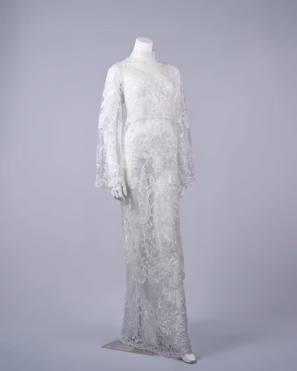 Smickrande vacker långklänning, med exklusive pärlspets, hög krage och vida ärmar. Spetsen ger ett vackert fall som passar perfekt till festliga tillfällen. Som tex. bröllop! Matcha den med ett snyggt skärp och om man vill, en lång eller kort underklänning.